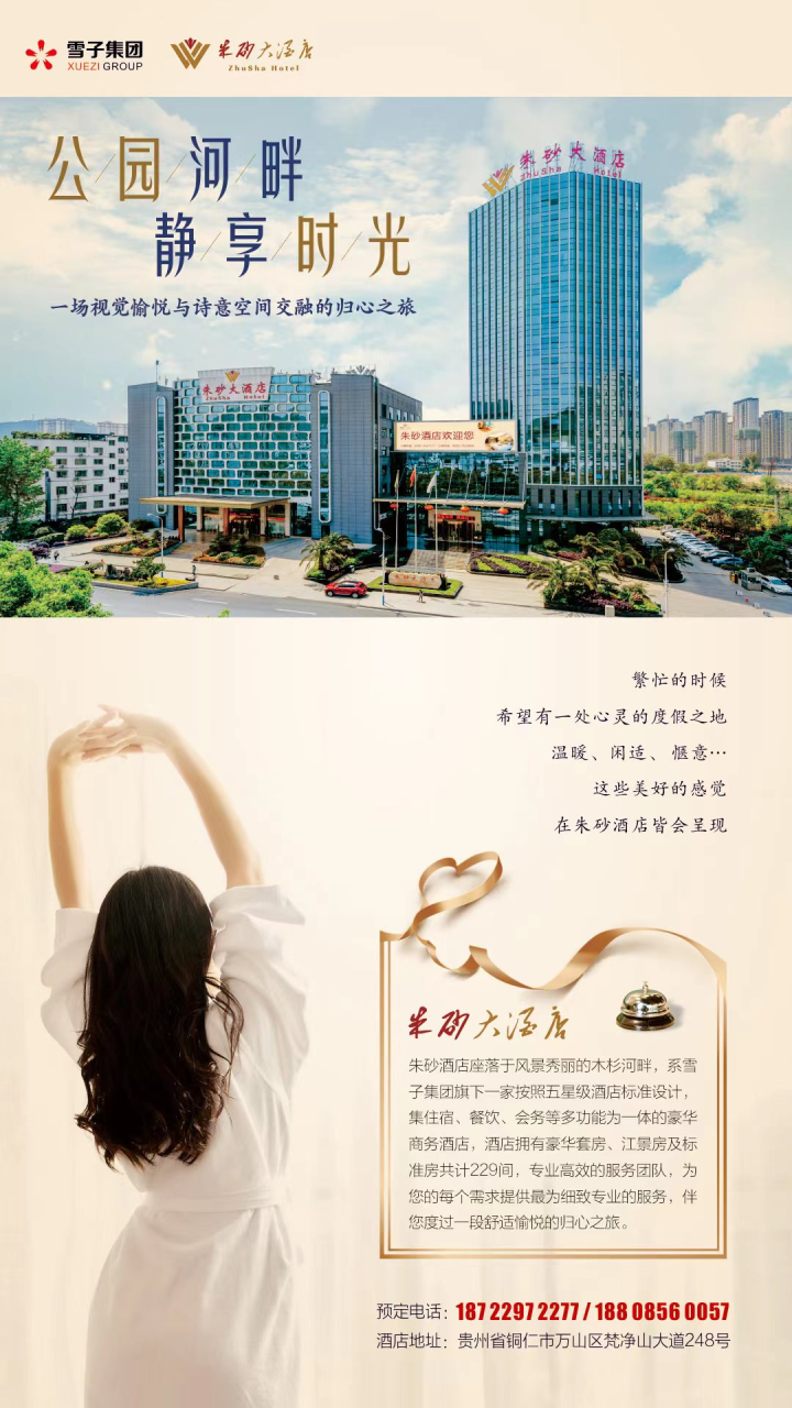 铜仁朱砂大酒店系雪子集团旗下一家按照五星级酒店标准设计建设的商务度假酒店,位于美丽的木杉河畔。酒店拥有229间客房(包括豪华套房、江景客房和商务客房)。餐厅里提供川、湘、黔、粤菜系佳肴,满足客人的味蕾需求。此外,酒店还提供会务、机场车站接送、洗衣服务等多种服务。