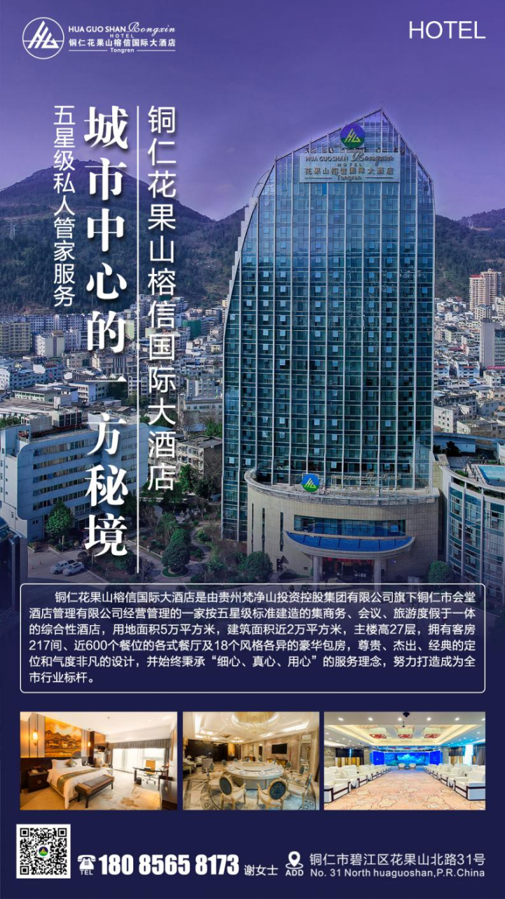 铜仁花果山榕信国际大酒店位于碧江区花果山上,鸟语花香、林木葱郁、曲径通幽 、俯瞰全城、景色秀美,周边商贾云集,购物出行便捷。用地面积达8万平米,建筑面积5万平米,与3000亩原生态山地和水域交相辉映。酒店外观恢宏、造型新颖,大堂典雅大气、流光溢彩,客房空间宽敞、高雅气派,床铺宽大柔软、配设齐全。中、西餐厅汇聚多种风味美食,为举办各类宴请的您呈上饕餮大餐。多功能厅、专用展览厅、会议室配置先进,辅以商务中心的鼎力合作,定使各类宴会、会务、展示圆满举行。茶艺吧、棋牌室、桌球室、室内外泳池都是您休闲、健身、会客的好去处,让您不出酒店即可尊享品质生活,感受城市花园的宁静与幽雅。