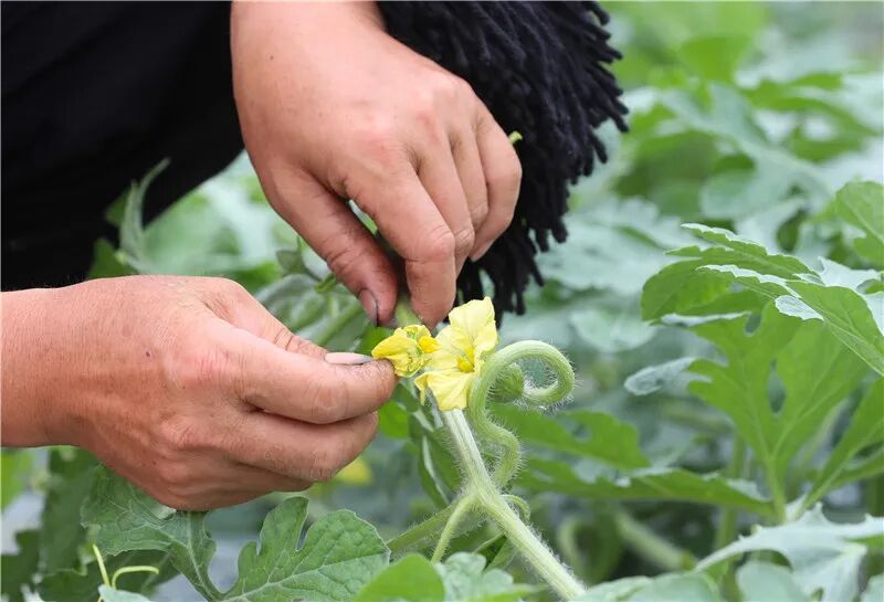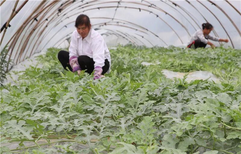 ↑↑↑5月5日,瓜农在亚鱼乡郭家湾村西瓜大棚里劳作。