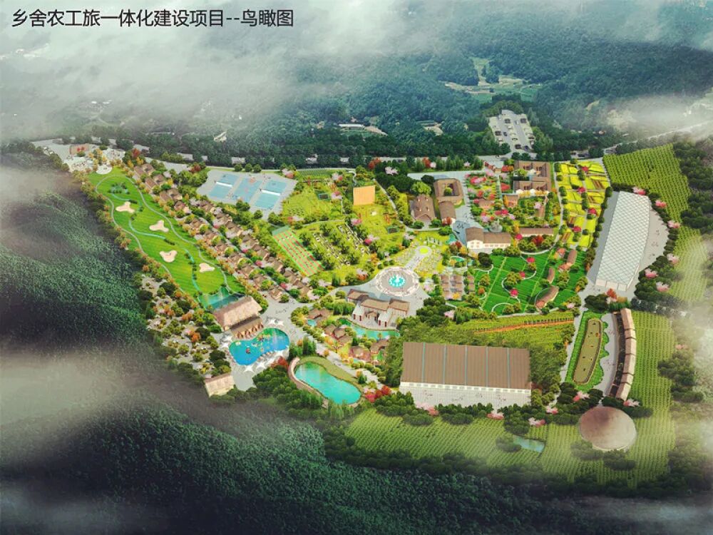 “这是游客接待中心,下面是游泳池,后方是工业区,养殖场背靠的那个山头是水果种植基地,国防教育基地建设项目正在进一步筹划中,建成后可带动更多的村民就业致富。”