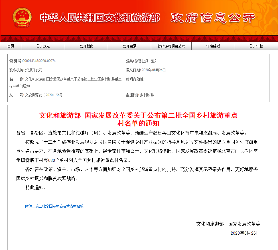 近日,文化和旅游部与国家发展改革委员会联合发布了《文化和旅游部 国家发展改革委员会关于公布第二批全国乡村旅游重点村名单的通知》。
