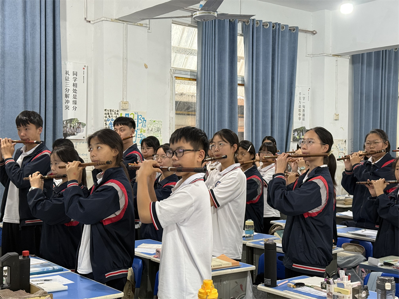 走进玉屏第一中学,校园内绿树成荫、环境优美。一阵悠扬悦耳的竹笛声随风飘来,循声而去,只见教室内学生们正全神贯注地进行着箫笛大课间演奏,他们手持竹笛,神情专注,指尖在笛孔上跳跃,奏响充满青春活力与传统文化韵味的乐章。