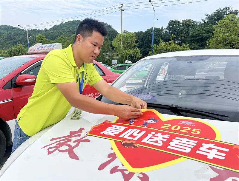 现场气氛热烈,爱心司机们为车辆逐一粘贴红底白字的“爱心送考车”车贴,这一标识不仅是爱心送考的承诺,更承载着对考生的温暖关怀。爱心司机中既有连续多年参与的老司机,也有首次加入的年轻司机,每个人眼中都闪烁着热忱与责任。