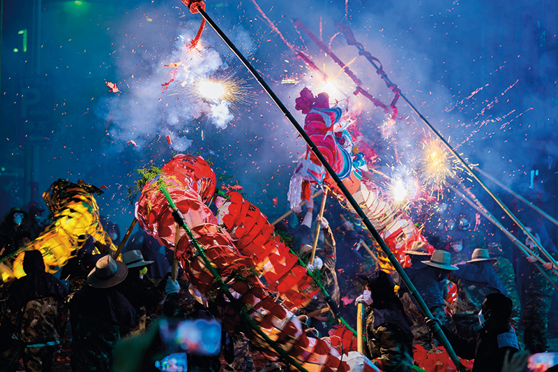 在贵州省施秉县,人们在舞龙队伍经过时进行“炸龙”活动(2025年2月6日摄)。刘续摄/本刊