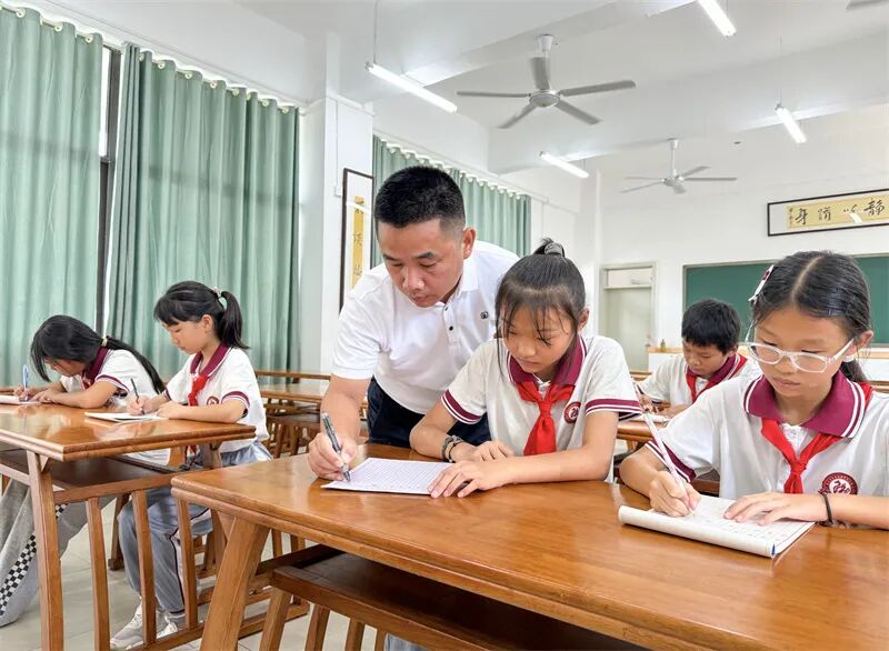 梁昌恒深知,每个学生都是独特的个体,学习能力和知识接受程度存在差别。在德龙小学开展的第二课堂活动中,梁昌恒负责书法兴趣小组,在课后摸底时,发现学生书法基础普遍薄弱,握笔姿势也不正确。因此,他根据学生的实际情况,将学生分为基础入门组和进阶提高组,针对性教学。