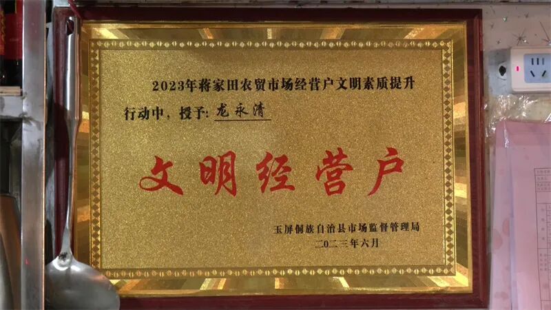 2023年6月,玉屏市场监管局开展评选“文明经营户”,对蒋家田农贸市场文明素质提升行动中表现突出的商家授牌,龙永清因文明经营、秩序规范、卫生达标、商品质量良好而入选。