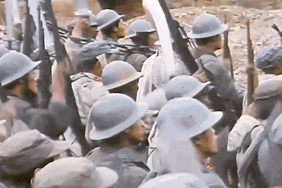 “阵地拿下后,一面破旗插在山顶,三个伤痕累累的士兵站在旗下把5000块民国法币抛向了天空:‘(兄弟都不在了)现在要钱有什么意义呢?’”