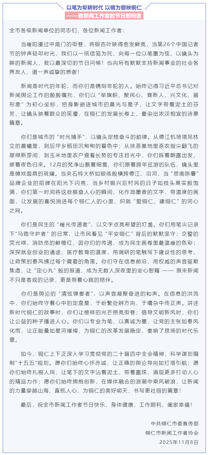 以笔为犁耕时代 以镜为窗映铜仁——致新闻工作者的节日慰问信