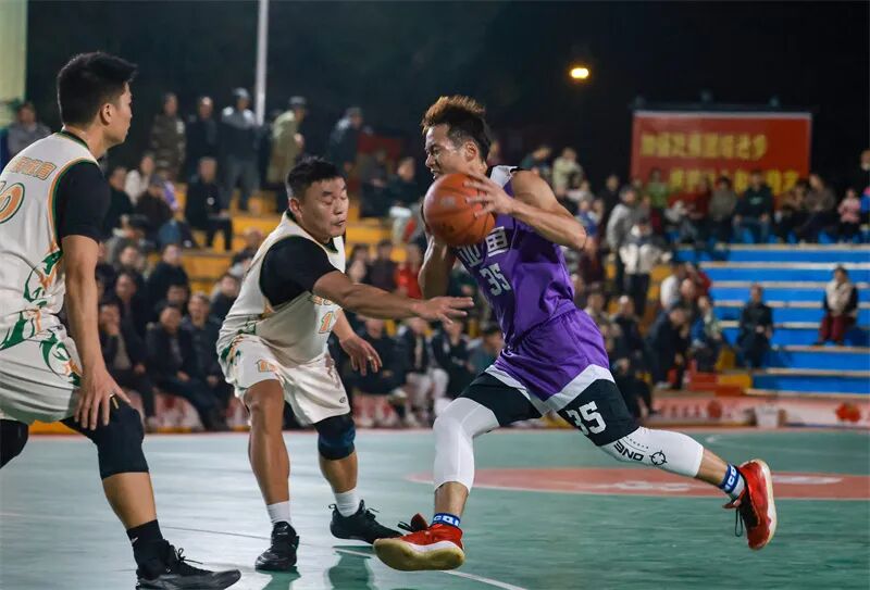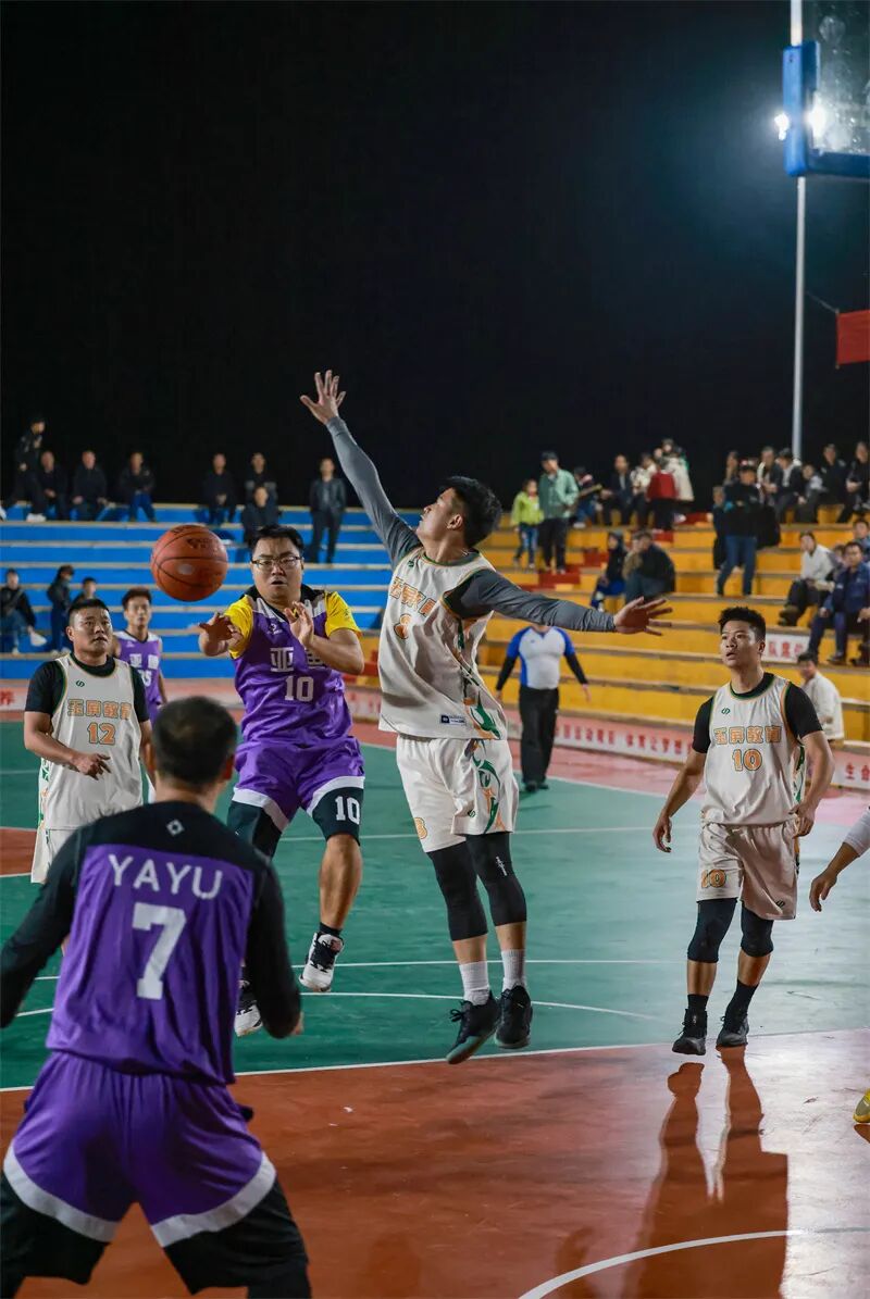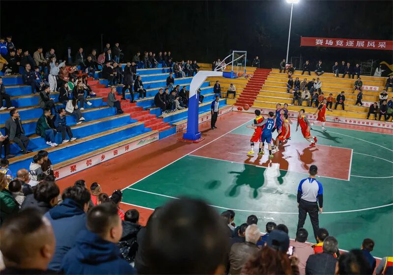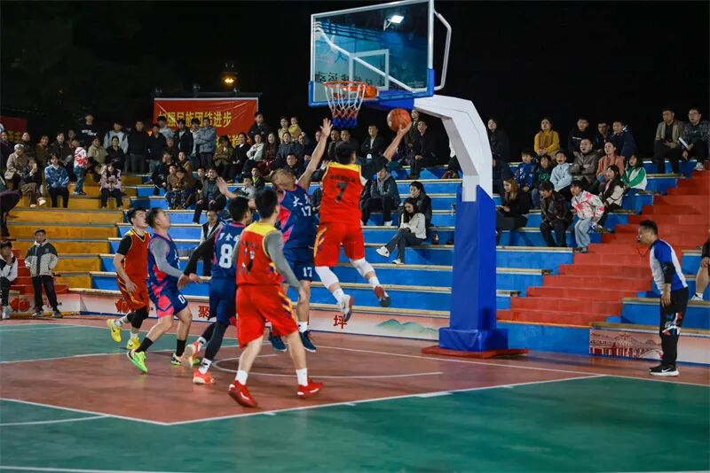 当晚18时,简短的开幕式后,揭幕战在康养田坪篮球队与大龙街道篮球队之间正式打响。随着裁判一声清脆的哨响,赛场瞬间沸腾起来,运动员们斗志昂扬,带球突破、精准传球、跃起投篮、严密防守……每一个动作都充满力量与技巧,引得场下观众掌声、欢呼声、加油声此起彼伏,球场瞬间化作一片欢乐的海洋。