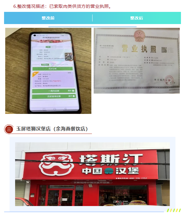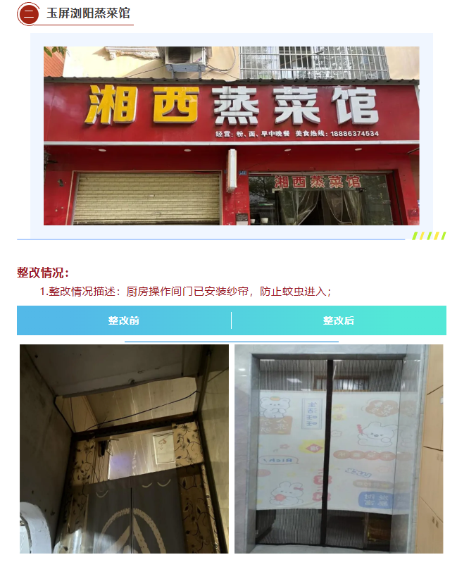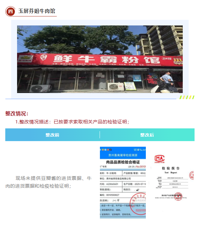 玉屏侗族自治县市场监督管理局发布了《玉屏2025年餐饮环节“红黑榜”(第五期)》,对检查发现问题较多的“黑榜”食品餐饮环节经营单位进行公开曝光后,得到了社会各界的广泛关注。相关食品餐饮环节经营单位高度重视、认真整改。今天,让我们一起来看看“黑榜”食品餐饮经营单位的整改情况吧。