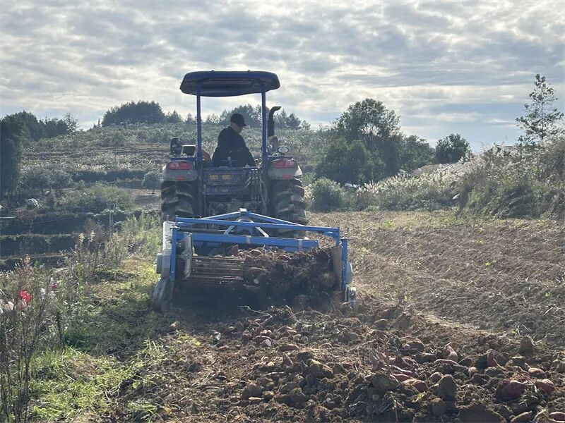 基地里,拖拉机来回穿梭翻耕松土,一个个色泽鲜亮、体态饱满的红薯破土而出,很快在田垄上堆成“小山”。工人们分工协作、手脚麻利,分拣、装袋、装车等步骤井然有序,田间地头一派热火朝天的采收景象。