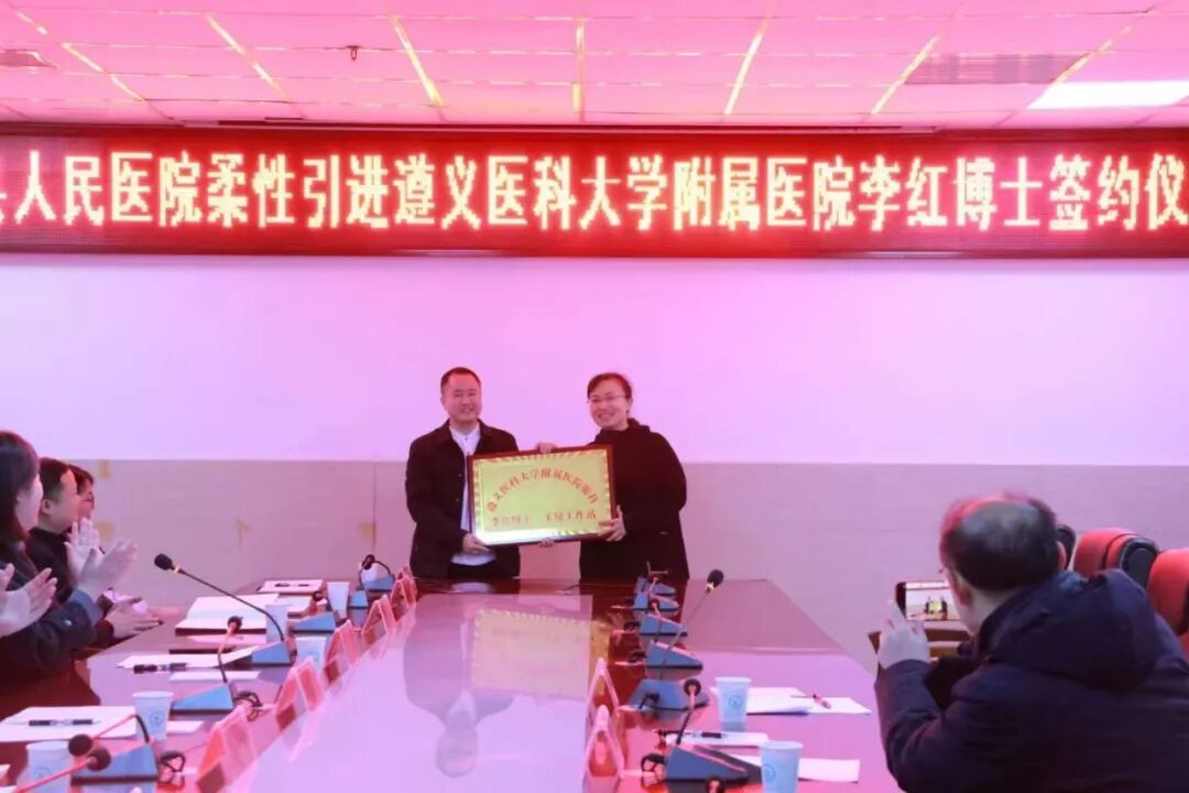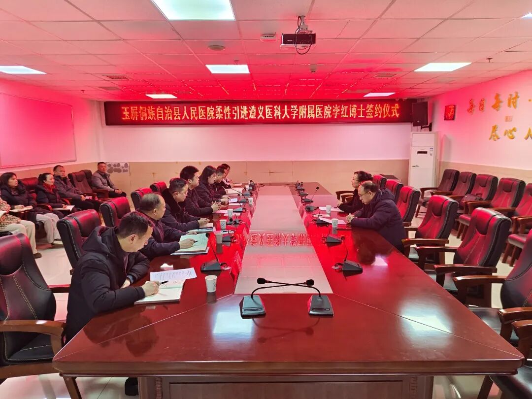 2月1日,玉屏侗族自治县人民医院引进遵义医科大学附属医院李红博士签约授牌仪式举行。县委常委、县委组织部部长冉雪芹出席仪式并讲话,县人民政府副县长郑美妮主持。遵义医科大学附属医院眼科主任、主任医师、医学博士、硕士研究生导师李红,副主任医师、硕士研究生导师江兵,县卫生健康局主要负责同志,县人民医院班子成员及相关科室同志参加仪式。