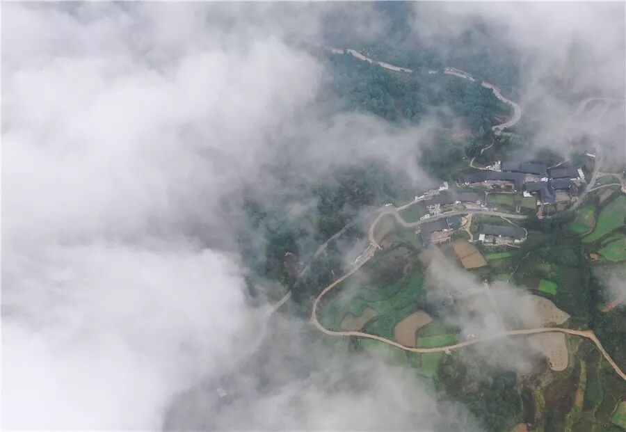 10月21日,玉屏侗族自治县皂角坪街道铁家溪村上空出现平流雾景观,乡村、公路、山峦在雾气中若隐若现,美如仙境。