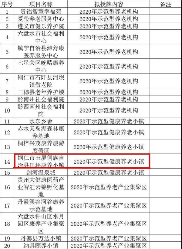据贵州省民政厅消息,为贯彻落实决策部署和深入实施贵州省养老服务创新发展工程,经市场主体自愿申报、各市(州)民政部门初审并推荐、省级民政部门复核审议等程序,拟对20个示范型健康养老项目进行授牌并公示。