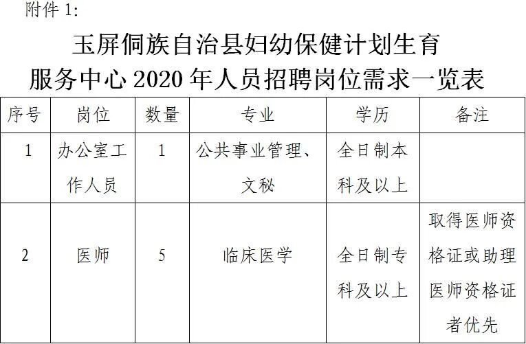 坚持德才兼备和公开、平等、竞争、择优的原则,采取自愿报名,统一考试(面试)的办法进行。 1.热爱医院工作,有吃苦耐劳及奉献精神,思想进步,具有较强的责任心,服从工作安排。 2.身体健康,五官端正,年龄35岁以下,女性身高1.55cm以上,男性身高1.65cm以上,并符合应聘岗位要求的其他条件。 2020年7月15日08:00—11:30,14:30—17:00 玉屏侗族自治县妇幼保健计划生育服务中心九楼人事科(玉屏康华花园二小旁) 报考者需持本人身份证、毕业证、资格证及相关证件原件及复印件,以及本人近期免冠同底2寸照片1张在现场报名(不接受其他任何报名方式)。 (1)笔试:2020年7月16日9:00—10:00,玉屏妇幼保健计划生育服务中心九楼大会议室 (2)面试:2020年7月16日15:00开始,玉屏妇幼保健计划生育服务中心九楼小会议室 (1)报考人员持本人有效居民身份证参加笔试、面试,迟到超过15分钟者不得入场。 (2)临床医生岗位的报考人数大于15人时,采取先笔试,然后按参考人数笔试成绩从高分到低分录取前10名进入面试,若末位成绩并列者同时进入面试。报考人数小于等于15人时,直接进入面试。笔试成绩不计入总成绩,面试成绩为考试最终成绩,面试成绩实行百分制,得分按四舍五入保留到小数点后两位。 (3)办公室工作人员岗位的报考人数大于3人时,采取先笔试,然后按参考人数笔试成绩从高分到低分录取前2名进入面试,若末位成绩并列者同时进入面试。报考人数小于等于3人时,直接进入面试。笔试成绩不计入总成绩,面试成绩为考试最终成绩,面试成绩实行百分制,得分按四舍五入保留到小数点后两位。 临床医生岗位面试成绩合格者(≥60分)前5名、办公室工作人员岗位面试成绩合格者(≥60分)第1名,均按照公务员要求进行体检,费用自行承担,但体检表由医院保存。如存在放弃体检或体检不合格者,分别按面试成绩合格者(≥60分)依次顺延。