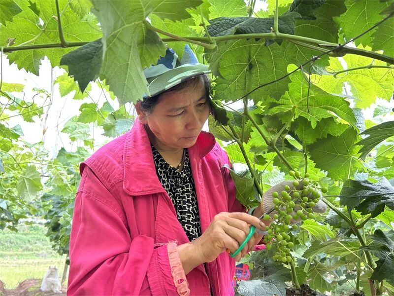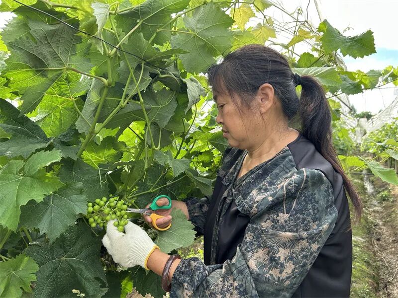 走进葡萄基地,葡萄藤蔓枝繁叶茂,一串串青翠似玉的葡萄果粒挨挨挤挤地缀满枝头。果园里时不时发出“咔咔咔”的声音,循声而去只见工人们正化身“理发师”,为葡萄进行着一对一的疏果作业。