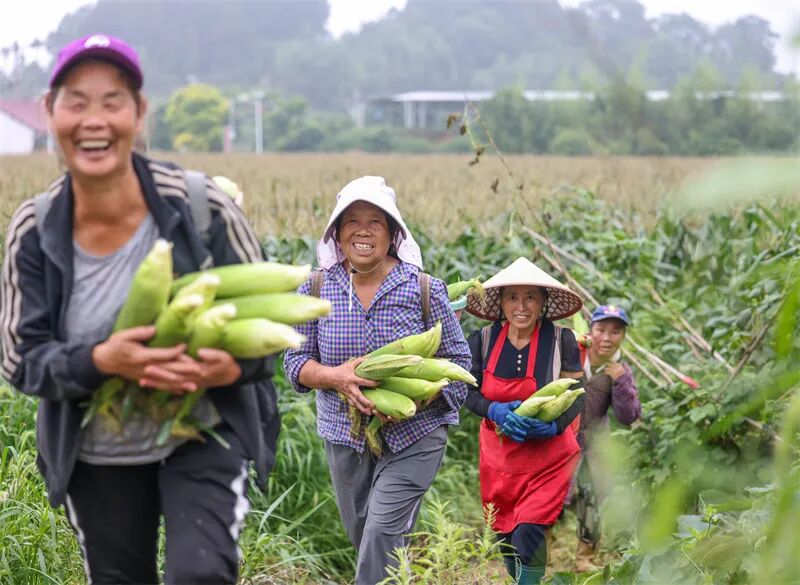 走进种植基地,只见连片的玉米植株挺拔茂盛,高约两米的秸秆上,一穗穗玉米颗粒饱满、排列紧实。10余名工人穿梭在玉米地中,动作娴熟地将成熟玉米掰下,再小心地将其装入专用编织袋,搬运装车,送往冷链中心待发。