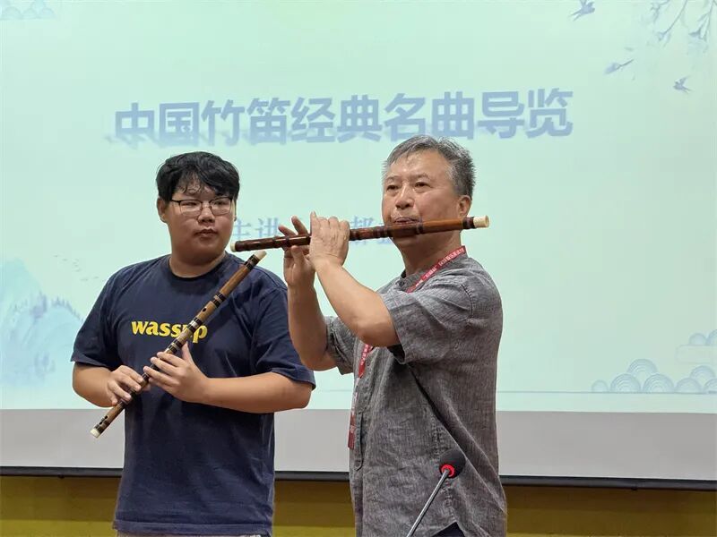 交流会上,授课老师们各展风采。王溪与郝益军围绕中国竹笛经典名曲展开讲解,深入剖析经典曲目背后的文化内涵与艺术特色,通过现场演奏对比南北技巧的差异,让学员们领略到竹笛艺术在不同地域的独特魅力。宋泳与杨守成则分别针对洞箫和笙展开教学。他们通过现场演奏示范,结合经典曲目进行详细解读,将复杂的演奏技巧转化为通俗易懂的知识要点。从基本的指法、气息控制到高难度的情感表达,他们一一倾囊相授,为学员们提供了宝贵的学习经验。