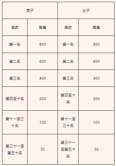 分男、女两个组别,每组各取前50名进行奖励(前三名发放奖金、奖杯、证书、郭家湾贡米(十斤装),第四名至第十名发放奖金、证书、郭家湾贡米(十斤装),第十一名至第五十名发放奖金。
