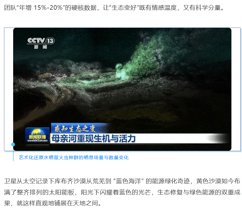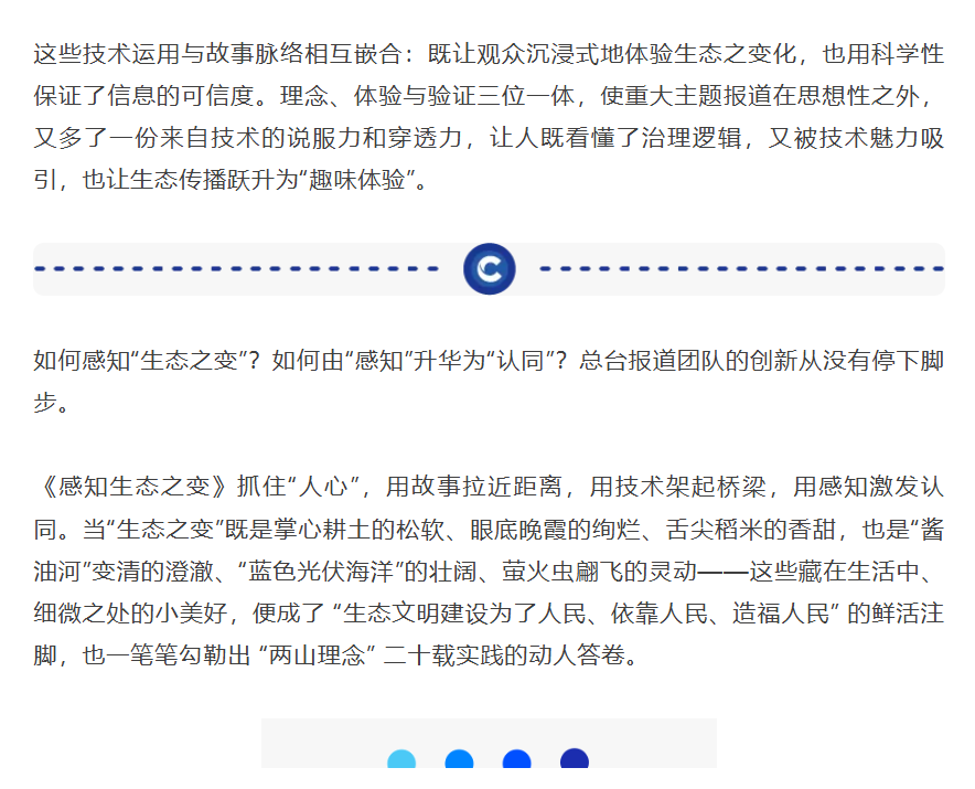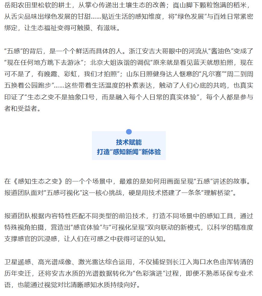 截至目前,《感知生态之变》八期报道全部获得全网置顶推荐,全网总触达量超10.68亿次。其中,电视端累计观看人次超3亿次,#超挑剔水质的萤火虫定居长江边# #万米高空看长江越来越清澈# #废渣场变身427万株花木大花园# 等多个热搜话题,吸引了众多网友关注。系列报道被国家发展改革委等20多个部委和相关单位,中国航天科技集团、中国贸促会等30多家央企国企和协会转发,引发社会各界的热烈讨论。网友在评论区晒着身边和家乡的生态变化,让报道变成了“大众参与的话题场”。业内专家和同行也高度评价,称其“形式新颖、巧用数据、文采斐然,是全媒体传播格局下的报道范例”。