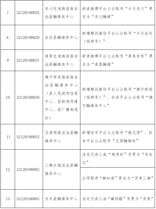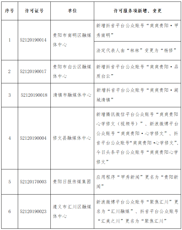 2025年9月,贵州省互联网信息办公室依法对相关单位提交的许可服务项新增、变更申请开展审批,同意有关许可服务项新增、变更事宜,现公示如下: