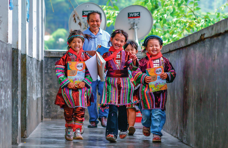 在贵州省黔东南苗族侗族自治州从江县西山镇的中寨教学点,学生们在下课后走出教室(2024年9月6日摄)杨文斌摄 / 本刊