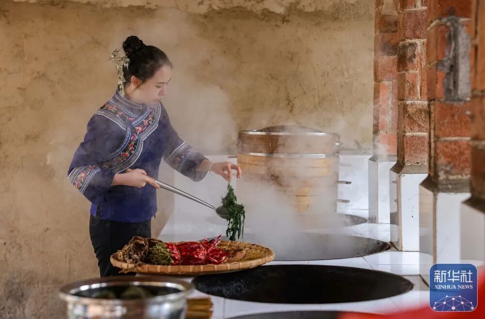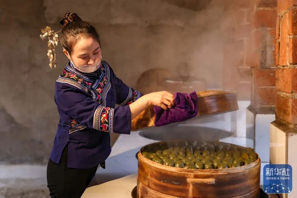 ↑1月23日,在贵州省铜仁市玉屏侗族自治县新店镇老寨村,村民在蒸制菜菜粑。