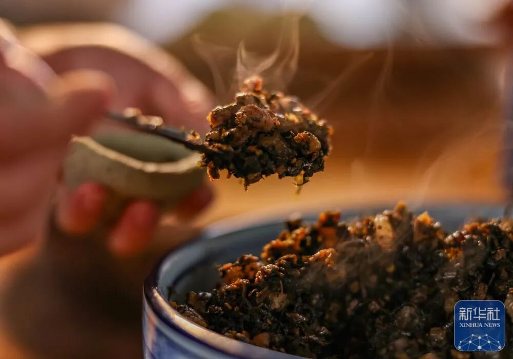 ↑1月23日,在贵州省铜仁市玉屏侗族自治县新店镇老寨村,村民在煮蒿菜准备制作菜菜粑。