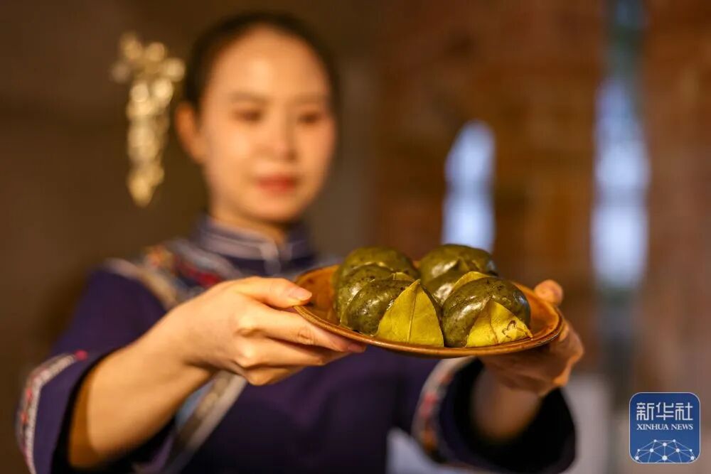 ↑1月23日,在贵州省铜仁市玉屏侗族自治县新店镇老寨村,村民展示蒸制好的菜菜粑。