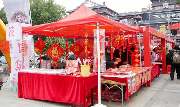 与此同时,年货市场也是热闹非凡,琳琅满目的商品让人目不暇接,农特产品、对联、水果等应有尽有,往来的市民们安心地在各摊位上挑选着自己心意的物品。