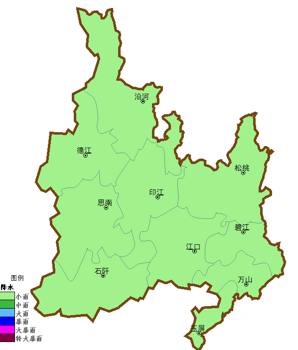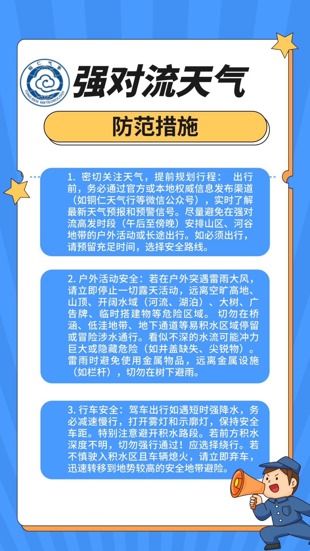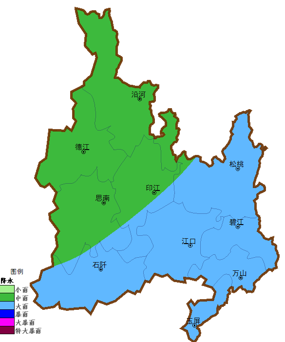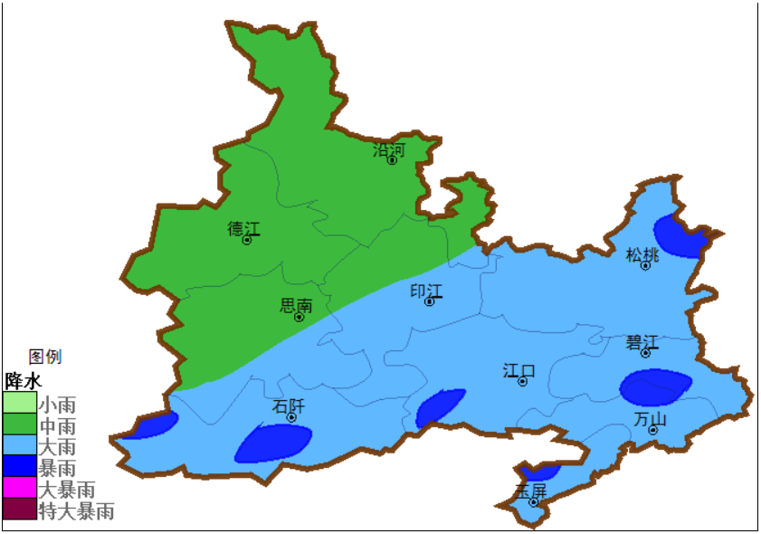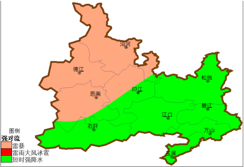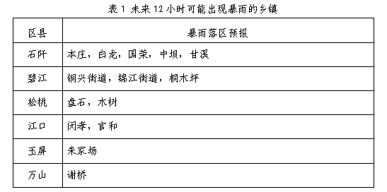铜仁市气象局、市自然资源局2026年4月15日16时联合发布铜仁市地质灾害气象风险预警:预计15日夜间阴天有阵雨或雷雨,全市雨量中到大雨,石阡、江口、碧江、万山、玉屏、松桃个别乡镇暴雨,强降水主要影响时段为15日23时-16日05时,最大小时雨强为20~30mm,最大累计雨量50~70mm。并伴有雷暴大风、短时强降水等强对流天气;16日白天多云到晴。15日20时至16日08时降水及强对流落区预报见图1,具体乡镇街道见表1。